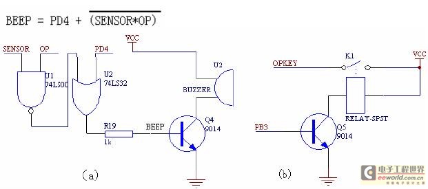 AVR 单片机的I/O 接口具有很强的驱动能力,灌入电流可直接驱动继电器、LED 等元件,从而简化驱动电路,可节约系统成本。对于报警电路部分,针对开关式传感器信号(开为高电平,关为低电平),开锁标志位(OP)以及单片机信号端口(PD4)采用逻辑分析后满足以下逻辑(具体实现见图4):
