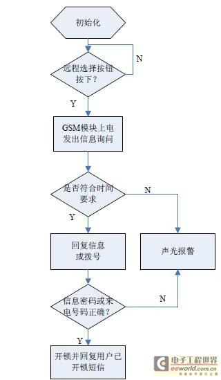 当手动选择远程开锁时,键盘便会被封锁。这时,电子锁GSM 模块启动,并发给用户手机一条询问信息,用户收到信息后,可通过拨号确认,或短信回复指定信息确认,单片机采集接收短信进行处理,从而实现开锁或报警,同时数字锁系统回复已开锁短信(open )。