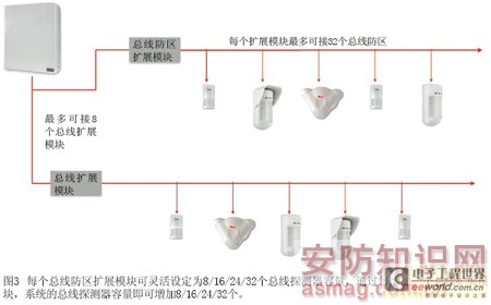 当总线探测器容量超出32个时,通过使用总线扩展模块可以连接多达128个总线探测器。每个总线防区扩展模块可灵活设定为8/16/24/32个总线探测器容量,每增加一个总线扩展模块,系统的总线探测器容量即可增加8/16/24/32个,如图3所示。