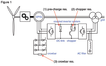 风轮机中的电阻包括了预充、斩波、短路器和交流滤波电阻。预充电阻能限制浪涌电流在开关开启时进入直流链路电容。为了做到如此,该器件需要高单脉冲能量和高额定电压。电阻的导抗也有助于限制浪涌电流。因此,绕线电阻是个最好的选择。用于预充电阻的单脉冲能量通常为5J。