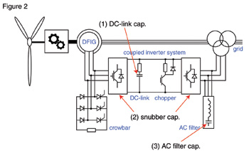 在风轮机中的电容包括了直流链路、缓冲器和交流滤波电容。直流链路电容用于稳定直流链路电压。无论是金属薄膜或是铝电极,在风轮机中的电感容量应该为3300~4700μF,额定电压为690~1000V。风轮机中的薄膜电容有两个优势:在介质被电击穿后的自恢复功能;不会因液体电极的损耗而影响寿命。