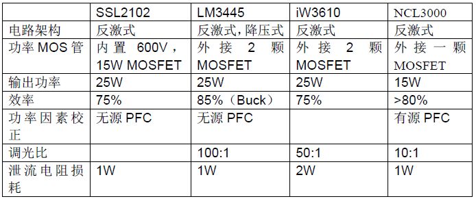 目前市场上主要有恩智浦的SSL2101/2,国半的LM3445,iWatt的iW3610和OnSemi的NCL3000四种兼容可控硅调光的驱动IC。其特点如下