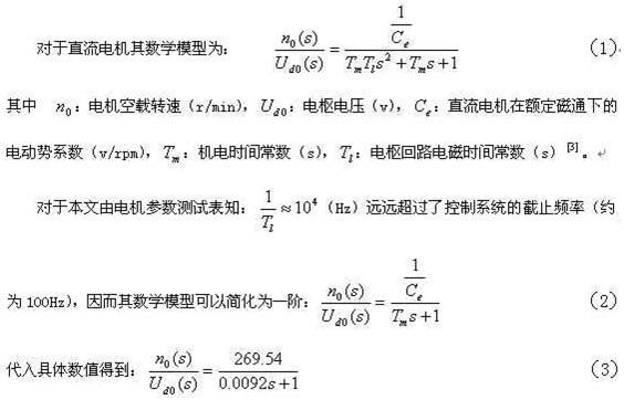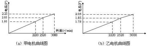本同步伺服系统甲、乙两台电机均为无刷直流电机,设计参数基本一致,电机供电电压为直流15伏,采用PWM调速方式。在正常供电情况下,PWM端输入电压信号大于1.4伏,电机开始转动,随着调速电压信号的加大,电机转速开始加快,但是很明显转速和调速电压之间不是线性关系。为此首先测定转速和调速电压之间的关系,然后将其分段线性化,使电机转速在较窄的范围内和调速电压建立近似线性关系,根据实验数据对于甲、乙两组电机分别算出在转速(r/s)不同的情况,调速电压(V)与转速之间的近似线性关系如下: