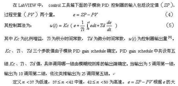 在LabVIEW前面板或控制面板的tools菜单下面打开 fuzzy logic controller design子选项就可以方便的设计和修改模糊控制器的隶属函数、规则库、推理规则等。设计的结果保存在一个以.fc结尾的文件中,以备在应用程序中调用。Control下面的Fuzzy controller子程序用于在程序中实现模糊控制算法。Control下面的Load fuzzy controller将.fc结尾的文件调入应用程序并将指定文件的PID参数加载到应用程序的模糊控制器中。三者紧密相连环环相扣,能方便直观的完成模糊控制器的设计、编辑、加载。