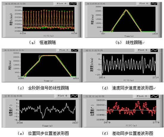 本同步伺服系统共完成了速度跟随、速度同步、位置同步、差动同步四种实验,其中速度跟随包括恒速跟随、线性跟随、含阶跃信号的线性跟随三种。以下图3中a、b、c中白色直线表示设定值,红色●表示甲电机的实验结果绿色×表示乙电机的实验结果; d、e中白色直线表示实际差值;f中白色直线表示设定值,红色●表示实际差值。