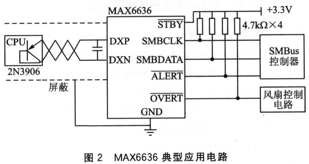 MAX6636的典型应用电路如图2所示,通过一个屏蔽的双绞线电缆与一个分离的晶体管相连。
