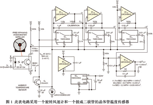 高升的化石燃料价格与对全球变暖的恐惧使人们对可再生能源的兴趣大增,并使得相关支持与演示仪表也受到关注。本设计顺应了这一形势,能够直接和方便地测量一种重要的可再生能源:风能。它便于对可能的风力发电机场地作快速而简单的初步评估,带有一个风速变换器,其中包含一个光学检测型叶片式风速计;一个温度传感器,其中包含一个接成二极管的晶体管(图1)。这些元件与一个数字/模拟混合电路相连接,它们共同提供实时、线性、有温度补偿的风能密度读数。