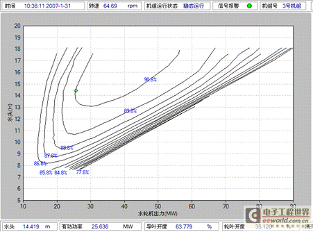 效率曲线图:由于事先不知道机组的k值,所以根据差压传感器测的差压值得到指数流量,再结合实测水头值、发电机功率等数据,得到当前时刻的机组相对效率,并以动态点的形式,显示在效率曲线中。图示如下: