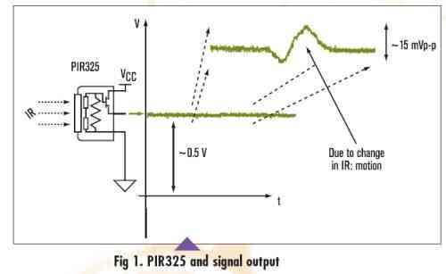 图1给出了该传感器的原理图和当检测到红外辐射发生变化时的输出特性。该传感器带有内置的光学滤波器,可以把检测到的辐射限制在人体辐射的波长范围(8-14?m)内。 辐射的变化经传感器内部放大后产生可从外部测到的模拟输出脉冲。该输出信号(在几微伏到数十微伏之间,具体数值依赖于在传感器和辐射体之间的距离及辐射体的尺寸)与VCC相比仍非常小。要感知的这样小的峰峰变化需要特殊的设计考虑。另外,该输出随VCC的不同而发生幅度不同的偏移。该设计使用3V电池,所产生的输出偏移不超过500mV。