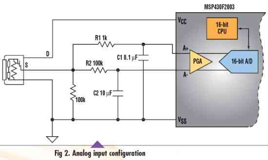 为了降低成本和功率,我们选择了TI公司的MSP430F2003 MCU,该器件把所有所要求的元件集成在单一芯片上,使我们的移动检测方案更小、更便宜,也更易于设计和控制。这个MCU集成了一个16比特AD转换器,可以提供更高的测量分辨率并可以降低对传感起的增益要求。该MCU的一个更重要的特性或许是包含在AD转换器中并可直接与传感器相连接的可编程增益放大器(PGA)。为使模拟连接更为直接,输入到PGA和AD转换器的信号是完全差动的。这些特性使我们更易于处理较大的信号偏移并更易于使传感器的小信号输出与AD转换器动态范围相匹配。