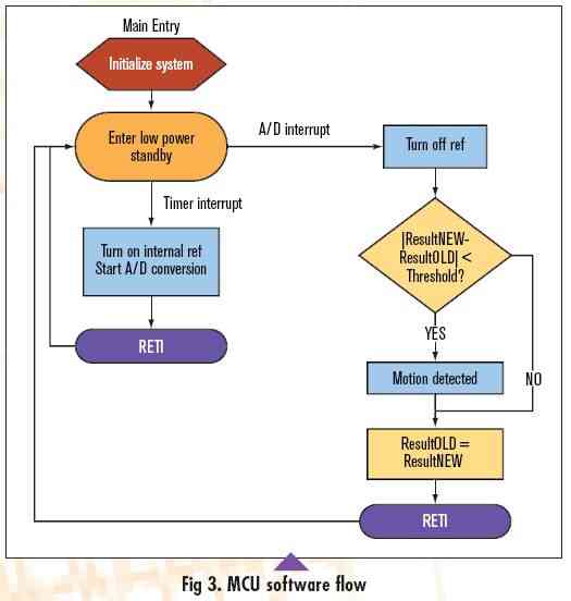 再次强调,两个主要的目标是低成本和低功耗。为满足这两个目标,我们在选择硬件时无疑用了很多心思。这种硬件不仅因模拟/数字混合集成而使成本更低,而且因为集成型器件更易于进行电源管理,功耗也更低。当然,为切实实现设计目标,开发高效的软件也是非常关键的。图3显示了该系统的软件总体流程。