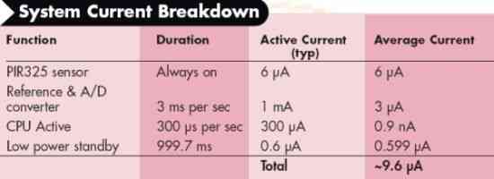 系统总电流将取决于系统的最终方案。从该表可以看到,工作状态的耗流量主要取决于参考电压和AD转换的电流,而平均耗流量主要取决于传感器电流。因为PIR325传感器的接通调整时间(几秒或更长)较长,不能采用对传感器采用周期式通电(power cycling)的方式。尽管该传感器必须保持连续接通,但电流消耗仍然很低。采用这里给出的硬件设计和软件流程,可以实现总平均电流低于10 ?A的通用移动检测系统。如果使用标准的3V CR2032电池,工作时间可超过两年。