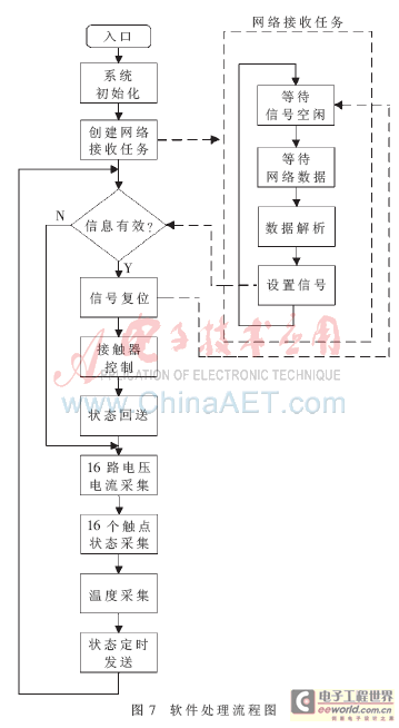网络接收任务与主任务的优先级相同,任务切换依靠系统时间片轮询来进行调度。两个任务之间依靠信号量进行通信,网络接收任务收到网络数据后对数据进行解析处理,并设置信号量以通知主任务进行相应的控制响应,其主要包括信号量复位、接触器控制、状态回送等。