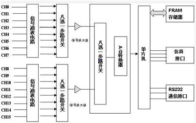 采用内含多路开关、A/D转换器、电压参考源的16位单片机CPU形成16通道低功耗温度记录仪。RC组成的滤波电路滤掉热电偶信号中的干扰信号,经八选一多路开关输入至运算放大器放大到适当电平,再输入至CPU 进行A/ D 采样,经数值转换和线性化后存贮至FRAM存贮器中。在整个测量结束后,由通信接口与PC 机相连,将数据传送给PC 机做进一步的分析和处理。电源部分则由低功耗低压差稳压电路和滤波电路组成,系统提供3.3 V 的工作电源。温度记录仪各零部件均选用工业级,使工作温度在- 45~85 ℃之间正常运行。图2为温度记录仪原理框图。
