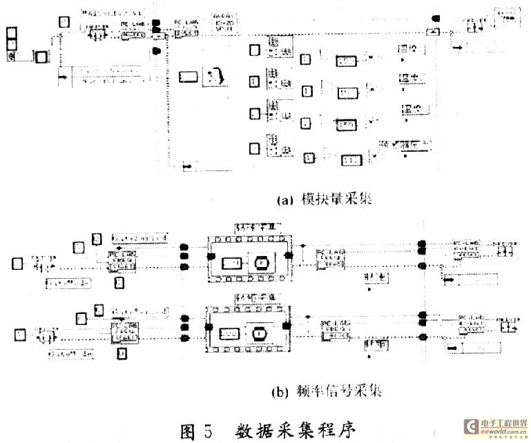 在数据采集部分,将压力、温度设定为一个采集任务,通过多路模拟量采集程序来完成,此采集程序主要有MAI Config.vi,MAI Volgagen In.vi和SplitlD Arrav.vi,Device open.vi及Device Close.vi模块构成,其结构如图5(a)所示。可总共进行8路模拟信号的同时采集,其采集的数组由Index Array模块进行分离,此处只使用其中的前四路,包括三路温度和一路压力信号。转速和转矩则分别进行采集,它们通过频率采集电路来完成,程序中用到的主要模块有CounteRFrea Start.vi,Counter Freq Read.vi和Counter Reset.vi,Deviceopen.vi及Device Close.vi,其采集周期设定为200 ms,具体结构见图5(b)。