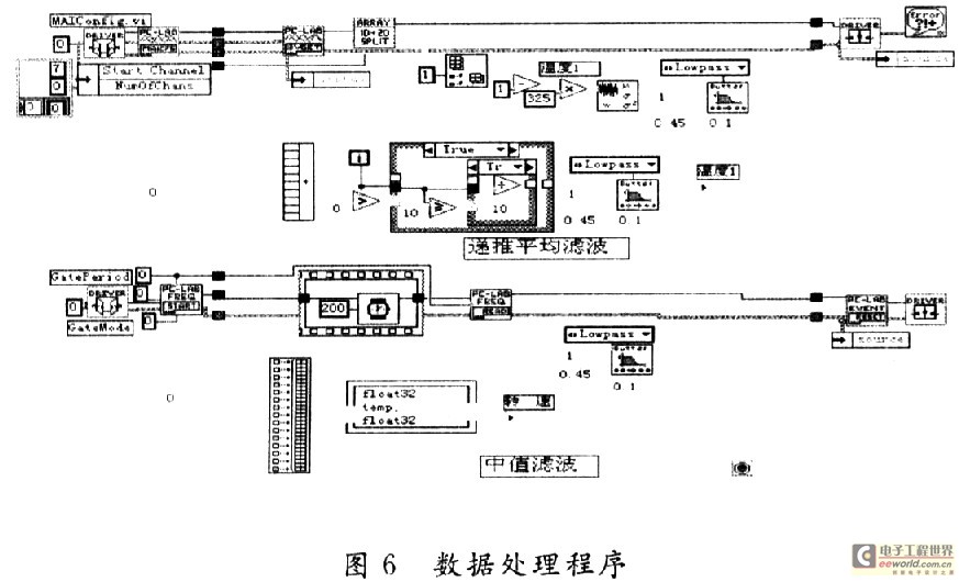 笔者通过利用LabVIEW中的移位寄存器来实现了平均滤波算法,具体实现方法如图6中递推平均滤波所示。先求取10个数的和,再求其平均数。
