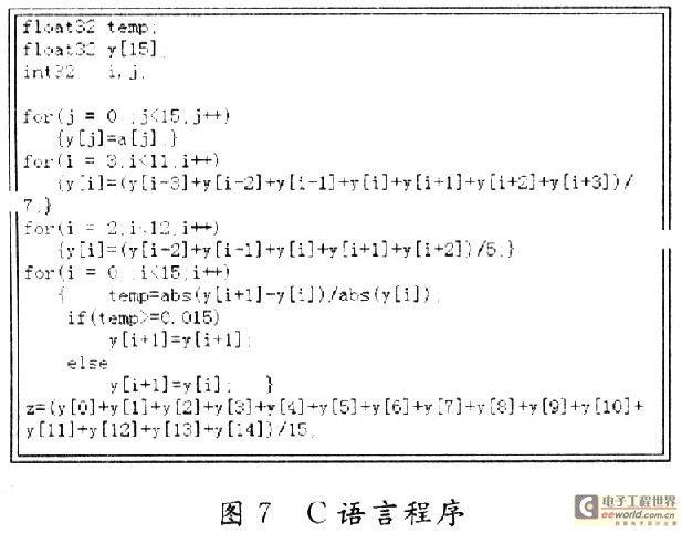 对于中值滤波算法的实现,利用别一般的模块实现起来比较繁琐,如果能用C语言来处理,就变得很简单。经过多次尝试,终于实现了在LabVIEW中嵌入C语言的方法,利用LabVlEW中的公式节点作为切入点,实现调用C语言进行处理。利用C语言的强大的数据处理能力,能很方便的完成一些复杂的算法。程序实现如图7中中值滤波所示,将采集的数据先利用Build Array模块转变成数组,再将数组作为公式节点的输入,C程序首先对采集的数据进行了两次求平均处理,之后又按照中值滤波算法进行处理。相应的C语言程序附如图7所示。