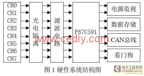采集板的具体结构如图1所示。主要以单片机 P87C591为核心,设计对8路电表进行数据采集,并可以将数据存入SEEROM中,另外带有掉电保护及通信接口等模块。