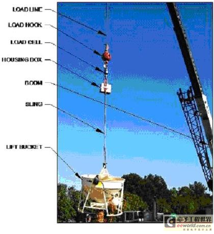 为了快速安全地进行测量,我们将荷重元传感器附在车载起重机悬挂铲斗的承重索上。我们还做了一个木盒收纳无线传输器及电源(图4),并将它悬挂在传感器的边上。我们采用简单的笔记本电池来给WLS-9237供电。最后,我们用钢索将荷重元传感器与铲斗连接,从而提供足够的空间,使填料倾倒时不会损坏荷重元传感器或相关的设备。WLS-9237Wi-FiDAQ设备与荷重元传感器连接,因此载重数据能够被轻松读取,并直接从现场记录,而不会受到起重机运行的影响。