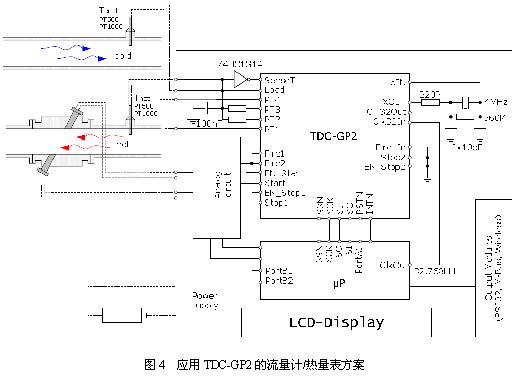 相对于使用传统测量方法的流量计,超声波流量计有着诸多的优点:它不会改变流体的流动状态,不对流体产生附加阻力;它可适应多种管径的流体测量,不会因管径的不同增加仪表成本;它的换能器可设计成夹装式,可作移动性测量。TDC-GP2作为高精度的时间测量芯片,不但集成了时间测量功能,还针对超声波流量计和热量表的应用提供超声波换能器驱动脉冲以及温度测量功能。相对于使用分立元件或者FPGA的超声波流量计方案,使用TDC-GP2的方案大大简化了硬件电路设计,显著降低了整机功耗,成为电路最简洁、功耗最低的超声波流量计方案。