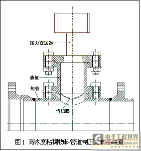但由于高浓度粘稠物料具有高粘性、高磨损性等物理特性,普通的压力传感器不能很好的应用。比如,一般的压力传感器的引压孔很小,在测量粘稠物料时极易被堵塞,无法正确读取压力。而膜片式压力传感器为了保证压力传递准确,膜片一般做得非常薄,如果用于粘稠物料的压力测量,短期内就会把膜片磨破,且粘稠物料中的固体小颗粒在输送过程中也很容易击穿金属膜片。因此,这种膜片式压力传感器只能短期、间断式的用于粘稠物料的测试(比如在本文中,用这种传感器作为标准传感器与自制传压装置进行比较)。 因此,我们专门研制了一种新型的粘稠物料压力传感器,以用于解决此类问题。