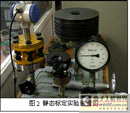 静态标定试验是在室温、常压下进行的。所用标定设备为活塞式压力计,型号为YS-600,精度:0.05,测量范围:0kgf/cm2~600 kgf/cm2(注:0~58.865MPa)。实验装置如图2所示。