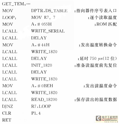 系统程序设计主要使用KeilC5l进行编写,但由于对DSl8820器件的读写时序要求比较严格,故采用汇编代码,其中温度读取子程序主要代码如下:
