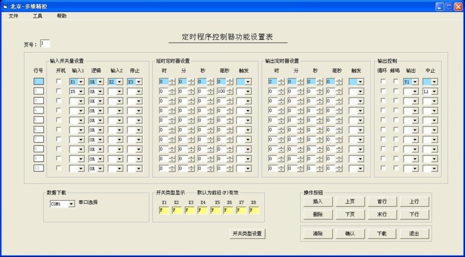 精控“定时程序控制器”是一种普及型的可设置控制器,具有多路开关量输入和多路开关量输出控制端,以及多行定时控制和程序控制,虽然没有可编程控制器PLC的功能强大,但是作为一般工业控制场合还是能够充分发挥其简单实用的特长,可以方便迅速的实现设备控制。不是全能,但是简便实用的控制器。 精控“定时程序控制器”的主要的点在于:无需编程,采用表格设置方式实现所需的定时和程序控制功能,非常适合不熟悉编程的人员使用。 基本功能: 通过设置能够实现:程序控制定时器、顺序定时控制、 逻辑控制、点动继电器、锁存继电器、点动开关、软启动开关、自锁开关、延时开关等功能。 应用领域: 各行业工业自动化控制,例如:机械自动化控制、服装机械控制、纺织机械控制、食品机械控制、电器控制、家电控制、机械手、灯光控制、节能控制、交通控制、喷泉控制、注塑机控制、电机控制、大中小学科普及应用等自动化控制普及领域。 功能设置: 只需在如下的功能设置表设置所需的功能,即可实现设备控制的众多功能。简单的控制功能只需几分钟即可完成,而且可以反复设置,反复调试,迅速实现所需的控制功能。功能设置表:请见下图。