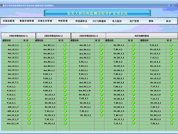 数据传输、处理与控制软件主要包括10大功能模块:登录模块、采集站配置模块、存储任务管理模块、采集任务管理模块、传感器状态模块、网络状态识别模块、数据下载与入库模块、电力监控模块、用户管理模块、系统帮助模块。界面如图7所示。