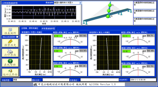 偏位监测项目实时显示、预警软件子模块界面如图9。除了各个预警软件子模块共有的操作按钮和显示控件外,该模块还有从数据处理与控制服务器传过来的1秒钟数据包波形图、安装截面位置示意图、预警灯和信息,以及当前纵横桥向当前的偏位情况实时显示。