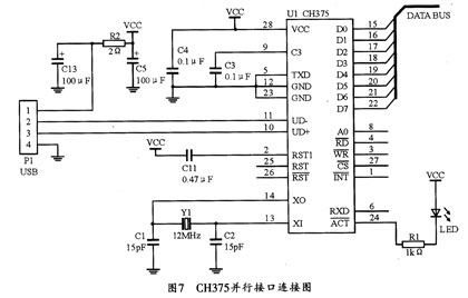 存储发送单元主要包括微处理器及其控制部分、CAN通讯接口部分、串口扩展和USB接口等。其中微处理器及其控制部分、CAN通讯接口部分跟前面介绍的模块基本一致。串口扩展部分带有两个RS-232接口和一个RS-485接口,并带有跳线可以选择两种状态为一个RS-232接口和一个RS-485接口或两个RS-232接口而没有RS-485接口。串口扩展采用16C550芯片。USB接口系统利用CH375作为控制器。并可通过串行输入输出或并行输入输出和中断输出来方便地实现USB移动存储设备与单片机系统的连接。CH375的并行接口连接图如图7所示。