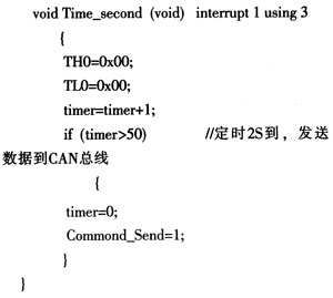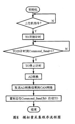 软件设计就是在模拟量采集单元初始化后等待上位机发来的数据采集请求指令,然后启动定时器TO并进行A/D转换,再将转换结果按CAN标准帧格式打包发送给存储发送单元。其程序流程图如图8所示。其中,定时器TO的中断子程序代码如下: