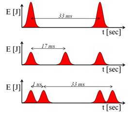 每个激光脉冲持续时间为8ns,且激光器可以在不同机制下工作(如图3)。两个激光器可以同时工作,或者分别按可调的延迟时间(1 μs–16.6 ms)进行工作。该系统对快速模数转换器的要求反映出它对数字化这样的信号需要足够的采样率来重建激光脉冲时间演化。