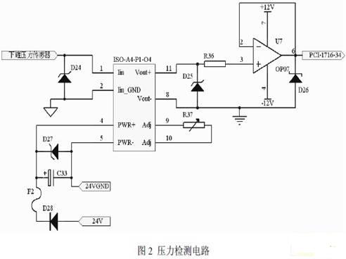 压力检测与隔离电路由压力传感器、I/V 转换与隔离电路和PCI-1716 的A/D 转换电路 组成。其中,压力传感器检测电路测量上、下铸罐和上、下储气罐共四路压力值,铸罐内为 绝压传感器,储气罐内为表压传感器。压力传感器测量范围0~1.0MPa,输出信号为4~20mA 电流值,电流经I/V 隔离转换模块ISO-A4-P1-O4 转换成与压力测量端完全隔离的0~5V 电 压信号,经PCI-1716 的16 位高分辨率A/D 模块转成数字量被控制软件采集,控制软件的 压力测量分辨率可达15.0Pa。控制软件根据采集到的压力值按照设定的工艺曲线,经控制算 法计算输出相应的数字与模拟控制信号完成开关阀与气动薄膜调节阀的调控,压力检测电路 如图2 所示。