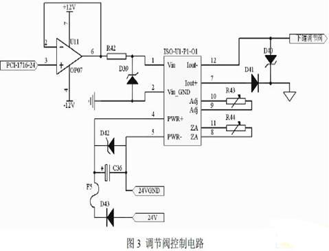 气动薄膜调节阀是通过调节其开度来控制进气量的,对调节阀的准确快速控制是对铸罐 内部压力控制的关键,这也是直接影响铸件质量的重要因素,控制软件通过PCI-1716 数据 采集卡的16 位D/A 模块输出端输出0~5V 电压经V/I 隔离转换模块ISO-U1-P1-O1 转换成 4~20mA 的电流信号来完成气动薄膜调节阀开度的控制。控制系统具有两路调节阀控制电 路,分别实现对上、下铸罐进气量的控制。调节阀控制电路如图3 所示。