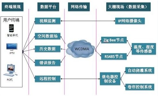 大棚监控及智能控制解决方案是通过光照、温度、湿度等无线传感器,对农作物温室内的温度,湿度信号以及光照、土壤温度、土壤含水量、CO浓度等环境参数进行实时采集,自动开启或者关闭指定设备(如远程控制浇灌、开关卷帘等)。