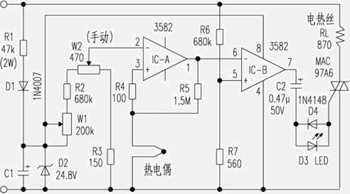 市电AC220V经R1降压、D1半波整流、D2削波稳压、C1滤波后作为比较器件IC的电源电压及调温设定电压源。IC-A③脚为热电偶检测电压输入端(与温度值对应);②脚为调温设定电压。在②、③脚两端电压比较后,由①脚输出。其中R5的作用是将输入的很少一部分反馈至同相输入端③脚,以使在小信号波动时输出锁定不变。当热电偶检到温度偏低时;③脚电平相对②脚低,使输出①脚也低。进而使IC-B放大器⑥脚相对于固定偏置的⑤脚偏低,使输出⑦脚为高。由于IC-B⑤脚电压是由AC220V经R6、R7分压而得,因而,频率、相位完全与AC220V相同。与⑥脚直流比较后在⑦脚输出交流电压。该交流电压经C2、D4、D3和D4反向并联(作用同双向二极管)触发双向可控硅,使相应的电压加到烙铁电热丝上,以达到恒温的目的。