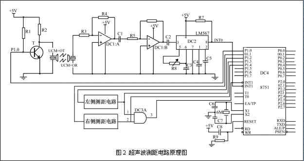 本系统的特点是利用单片机控制超声波的发射和对超声波自发射至接收往返时间的计时,单片机选用8751,经济易用,且片内有4K的ROM,便于编程。电路原理图如图2所示。其中只画出前方测距电路的接线图,左侧和右侧测距电路与前方测距电路相同,故省略之。