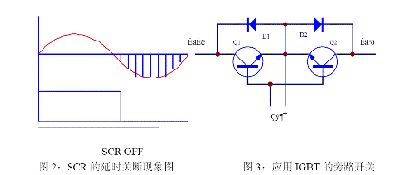 旁路开关常使用继电器和可控硅。继电器在中小功率的UPS 中广泛应用。优点是控制简单,成本低,缺点是继电器有转换时间,还有就是机电器件的寿命问题。可控硅常见于中大功率UPS 中。优点是控制电流大,没有切换时间。但缺点就是控制复杂,且由于可控硅的触发工作特性,在触发导通后要在反向偏置后才能关断,这样就会产生一个最大10ms 的环流电流,如图2。如果采用IGBT,如图3,则可以避免这个问题,使用IGBT 有控制简单的优点,但成本较高。其工作原理为:当输入为正半周时,电流流经Q1、D2,负半周时电流流经D1、Q2。