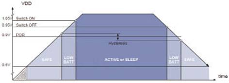 当电池的电压高于0.6V~0.7V时,SX8121进入安全模式,此种模式下所有管脚处于高阻状态,这保证了电池接入时芯片的安全启动。当电池电压低于0.9V时处于低电压模式,芯片将不会对接在BUTTON管脚上的按键操作出任何响应。MOTOR管脚和LED管脚均处于关闭状态,芯片每秒钟检测一次电池电压VDD,当VDD高于VON(典型值1.05V)时立即进入激活或休眠状态。芯片根据POLARITY管脚上的电平高低决定(上电过程中)当VDD高于VON时芯片处于激活还是休眠状态,此时芯片将会对BUTTON管脚电平的高低变化进行响应,并在激活和休眠状态之间进行切换。