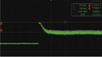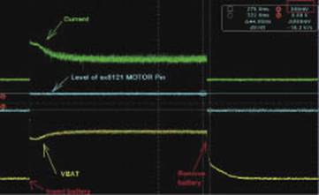 图4是将开关至于ON的位置,插拔电池时电池电压和输出电流以及SX8121的MOTOR管脚电压的变化。插入电池正常启动后,MOTOR管脚输出高电平,通过三极管输出大约1.1A的电流,而启动瞬间的峰值则超过2A,如图5所示。