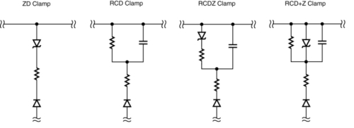 箝位电路用于将MOSFET上的最大电压控制到特定值,一旦MOSFET电压达到阈值,所有额外的漏感能量都会转移到箝位电路,或者先储存起来慢慢耗散,或者重新送回主电路。箝位的一个缺点是它会耗散功率并降低效率,因此,有许多不同类型的箝位电路可供选择(图2)。有多种箝位使用齐纳二极管来降低功耗,但它们会在齐纳二极管快速导通时增加EMI的产生量。RCD箝位能够很好地平衡效率、EMI产生量和成本,因此最为常用。