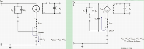 RCD箝位的工作原理为:MOSFET关断后,次级二极管立即保持反向偏置,励磁电流对漏极电容充电(图3a)。当初级绕组电压达到由变压器匝数所定义的反射输出电压(VOR)时,次级二极管关断,励磁能量传递到次级。漏感能量继续对变压器和漏极电容充电,直到初级绕组电压等于箝位电容电压(图3b)。
