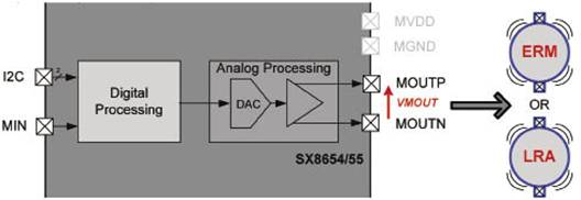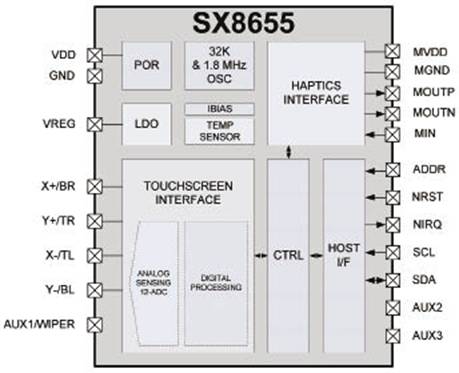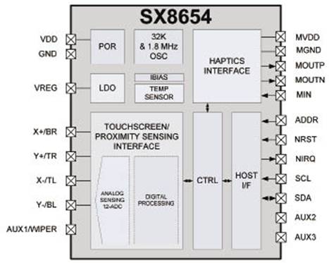SX8654和SX8655还集成了一个压电电机驱动器,用于线性谐振执行器(LRA)和偏心旋转质量(ERM)微电机,带有最高250mA的驱动电流。利用外部PWM信号或I2C串行接口可进行压电控制,提供简单的主接口并使其I/O需求降低。