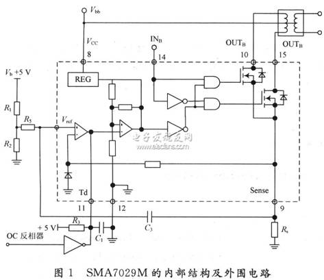 图1也给出基于SMA7029M芯片组电机驱动设计的外围电路,主要包含参考电压取样电路,OC门反向器输入电路,电流取样以及输出变压器耦合电路。通过设置电路中的R3=47 kΩ,C1=470 pF,可以得到脉宽约等于12μs。