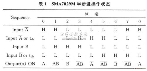 SMA7029M可以通过外部逻辑控制实现电机状态的改变,表1给出了详细的控制方式及输出结果。