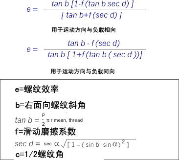 假定磨擦、扭矩和螺纹角相同,“V”形螺纹能传送的力约为梯形螺纹的85%。用式(1)和(2)可以求出效率,因为使用的螺纹是V形的,取决于负载方向。60度螺纹的效率除以29度螺纹效率就能计算出比率。