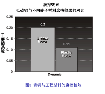 与此同时,驱动螺杆的螺母甚至显得更重要,该螺母通常是嵌入电机转子中的。传统的螺母材料采用轴承级的青铜并在其内部加工螺纹,这样做是综合考虑了物理稳定性和润滑性。当然,说它是综合考虑是因为其在这两方面并非特别优秀。直线电机中驱动螺母的较好材料是自润滑的热塑性材料。这是因为用新的工程塑料能使螺杆螺母运动磨擦系数降低。图3是不同内螺纹转子材料的磨擦性能的比较。