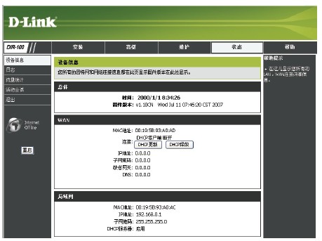 (7)上述步骤完成后,通过PC1登录一下互联网,如果成功,则表明网络调试成功,此时再次进入D-LINK路由器操作,进入“状态”选项,如果连接成功,在WAN一栏中会显示DHCP客户端连接,且“IP地址”、“子网掩码”等均会有所显示,请记下此IP地址,该IP为电信运营部门分配给ADSL的IP地址。比如为218.82.145.059。如图5所示。