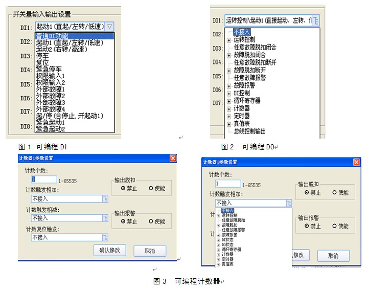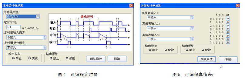 可编程逻辑功能,使用者对产品需求多种多样,将使用者的要求分好类,通过上位机配置软件进行功能编程。需要有行业经验丰富的工程师参与需求功能库的建立,通过时尽量在硬件上做到通用化,即硬件采用一个平台,对硬件平台写入不同的程序(是指由客户编制的程序),执行不同的功能。部分可编程功能可见图1~图5。